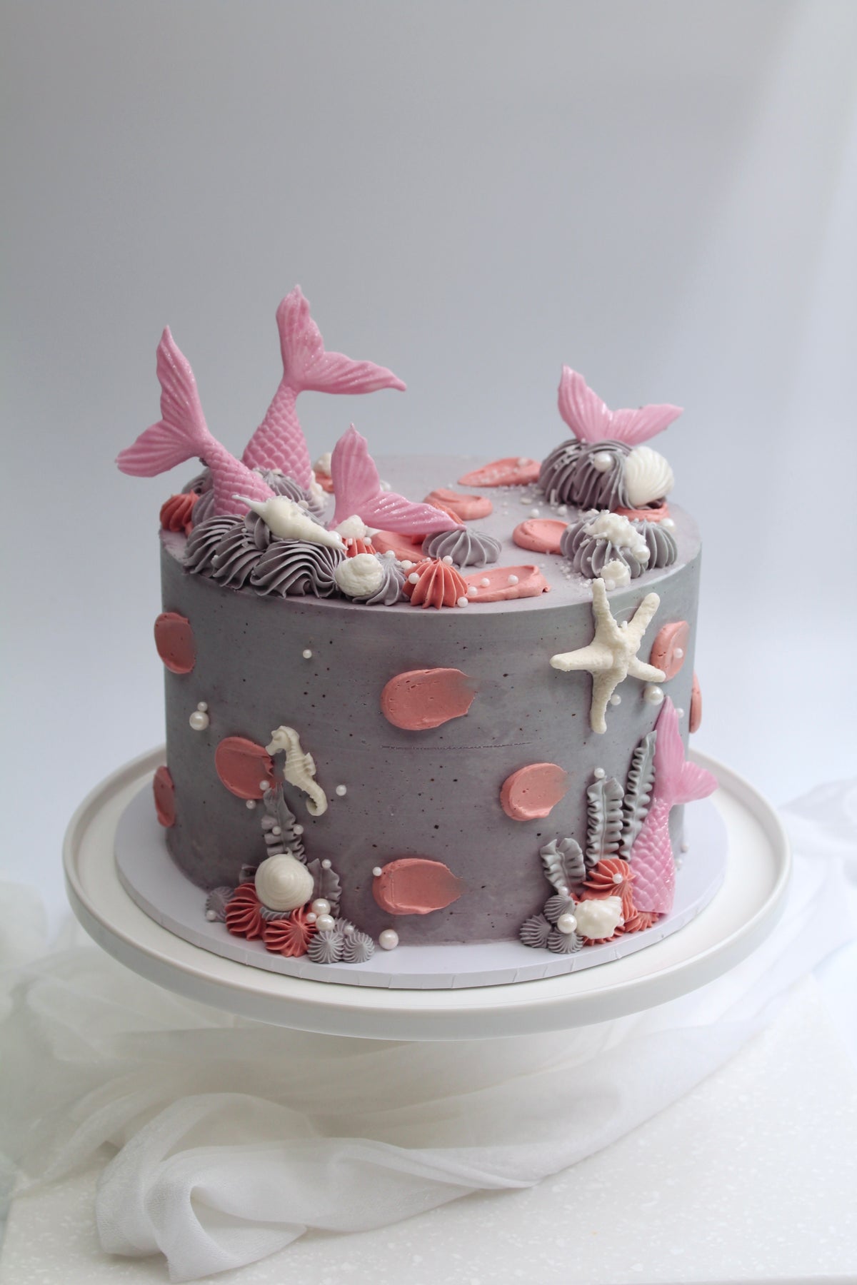 An under-the-sea dream with pink shimmering tails, sea shells and pearly details. A little mermaid magic for your celebration.